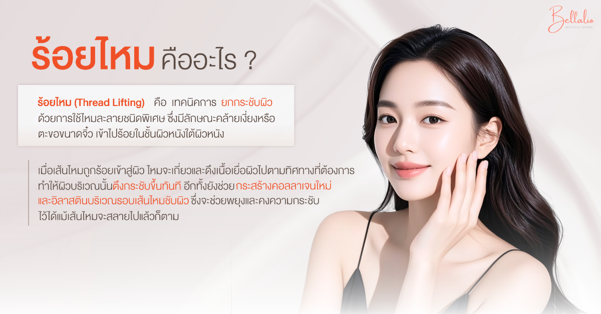 ร้อยไหม (Thread Lifting) คือ เทคนิคการยกกระชับผิวด้วยการใช้เข็มขนาดเล็กนำเส้นไหมละลายชนิดพิเศษ ซึ่งมีลักษณะคล้ายเงี่ยงหรือตะขอขนาดจิ๋ว เข้าไปร้อยในชั้นผิวหนังใต้ผิวหนัง