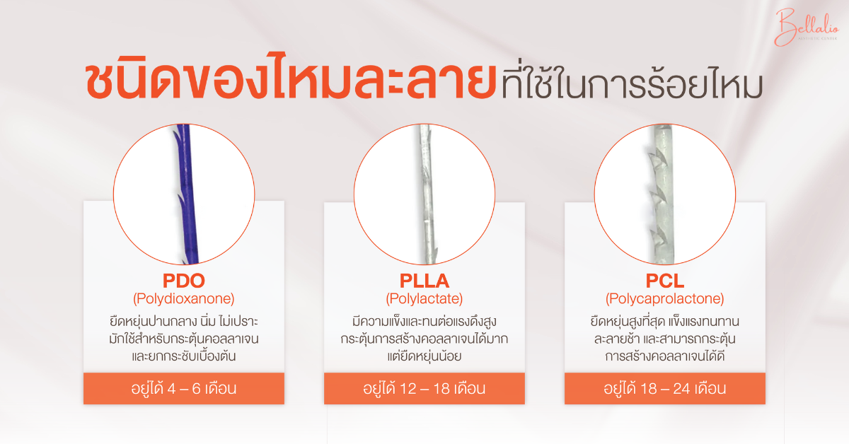 ไหมที่ใช้ในการร้อยไหมทั้งหมดเป็น ไหมละลาย (Absorbable Threads) ที่เกิดจากการสังเคราะห์ ซึ่งจะค่อยๆ สลายไปตามธรรมชาติเมื่อเวลาผ่านไป โดยแบ่งตามประเภทวัสดุได้ 3 ชนิดหลักๆ ที่มีคุณสมบัติแตกต่างกัน ดังนี้: