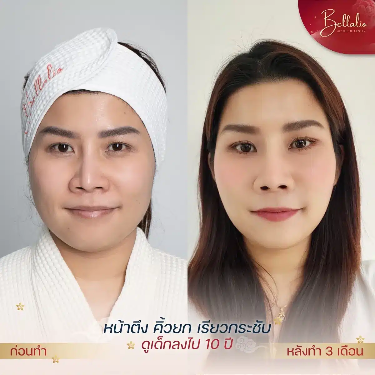 - ผลลัพธ์ที่ได้คือ ผิวหน้ายกกระชับ ริ้วรอยตื้นขึ้น รูขุมขนเล็กลง ผิวหน้าเรียบเนียน