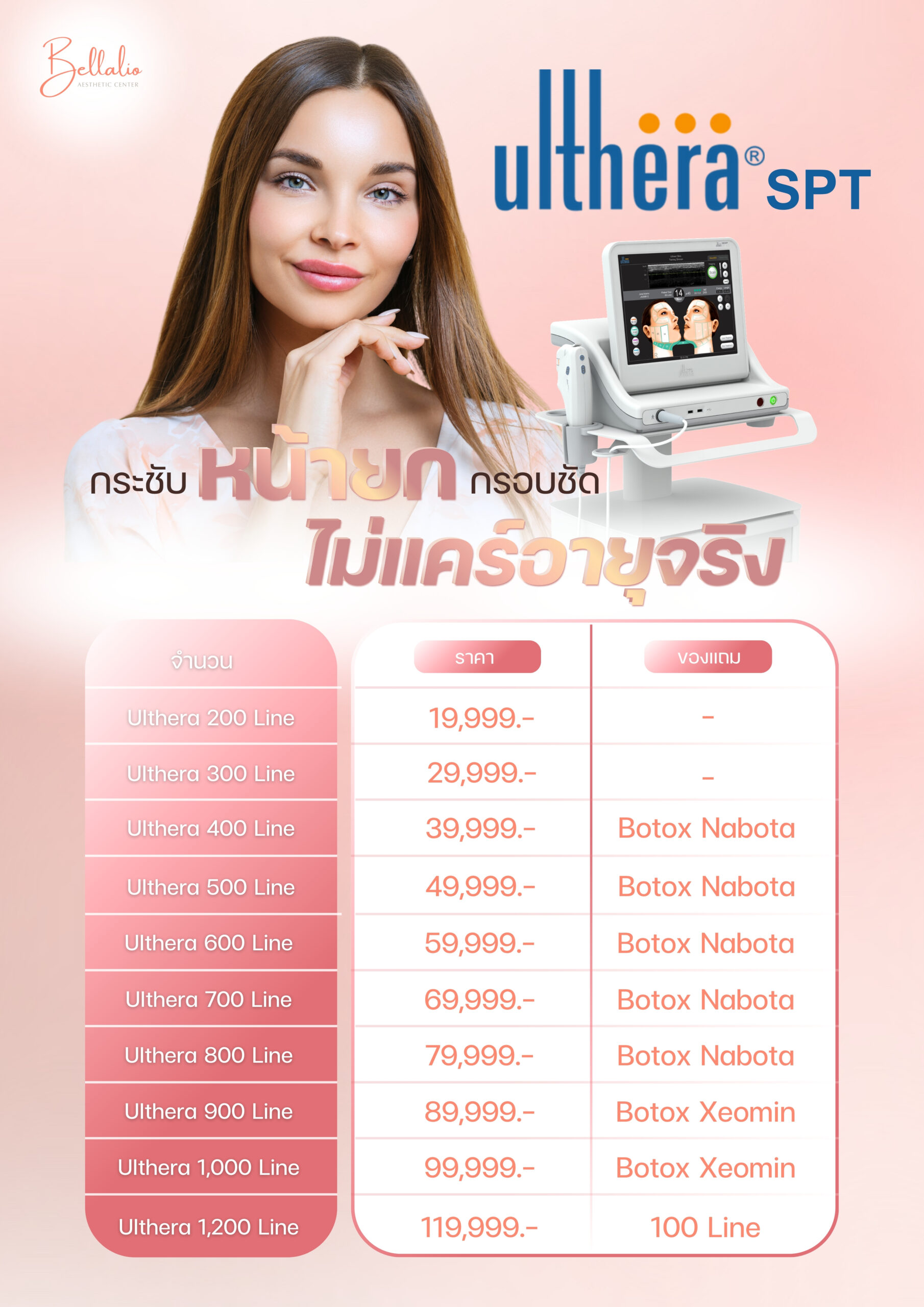 Ulthera SPT เป็นเทคโนโลยียกกระชับผิวและลดเลือนริ้วรอยที่ใช้คลื่นเสียงอัลตราซาวด์ความถี่สูง (High-Intensity Focused Ultrasound: HIFU) เพื่อกระตุ้นการสร้างคอลลาเจนและอีลาสตินในชั้นผิว ทำให้ผิวหน้ากระชับและดูอ่อนเยาว์ขึ้น